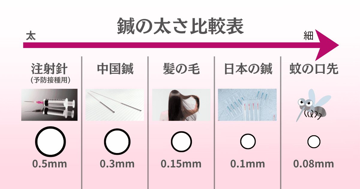 美容鍼で使用する鍼は、非常に細く作られています。その太さは、髪の毛よりも細い0.1〜0.2mm程度です。注射針の太さが0.4〜0.9mm程度であることを考えると、美容鍼の鍼がいかに細いかがわかります。
